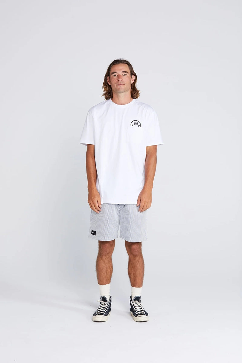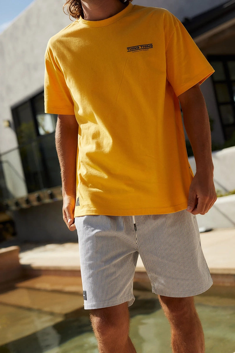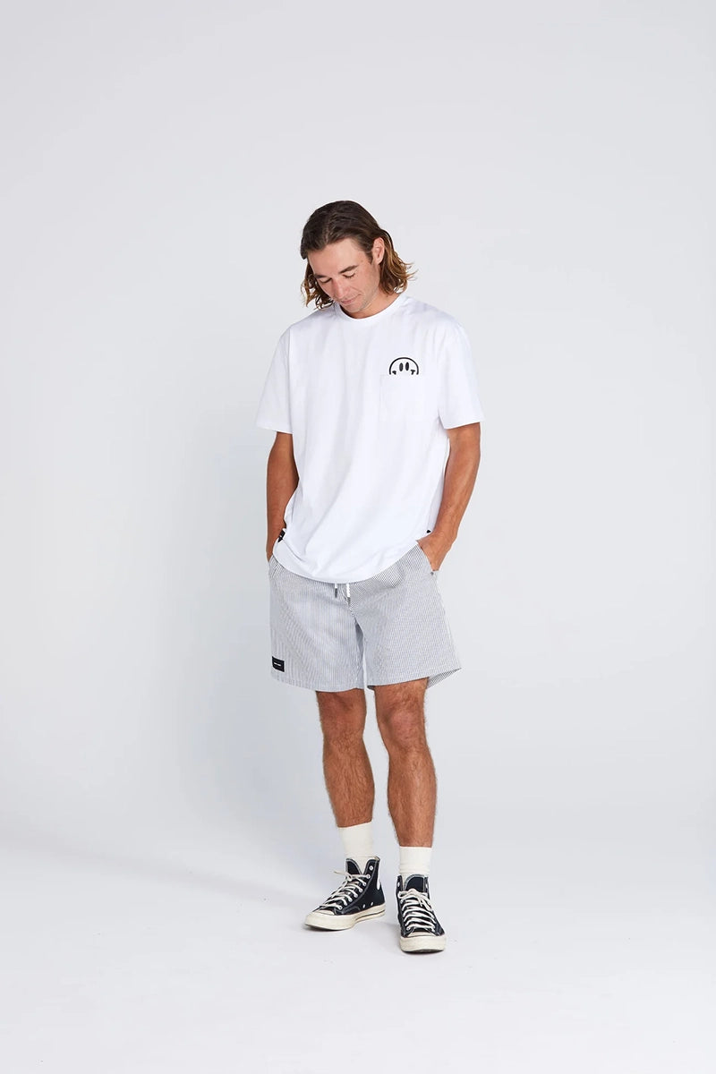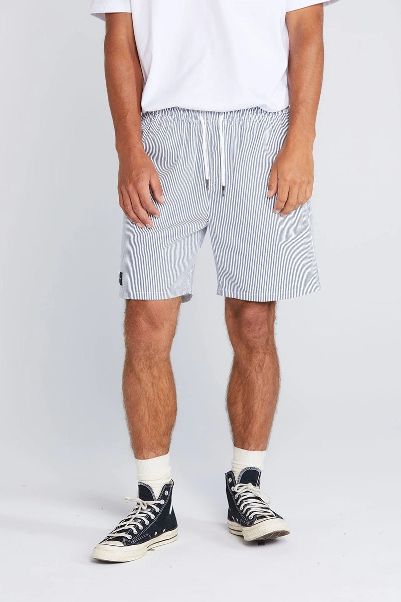 Made from striped drill fabric, it features an elasticated waistband with a drawcord and metal ends, practical pockets, and a patch badge. Easy.