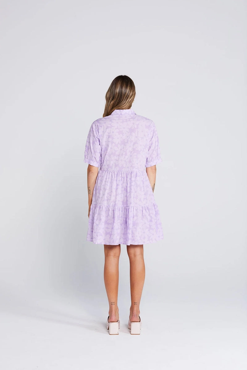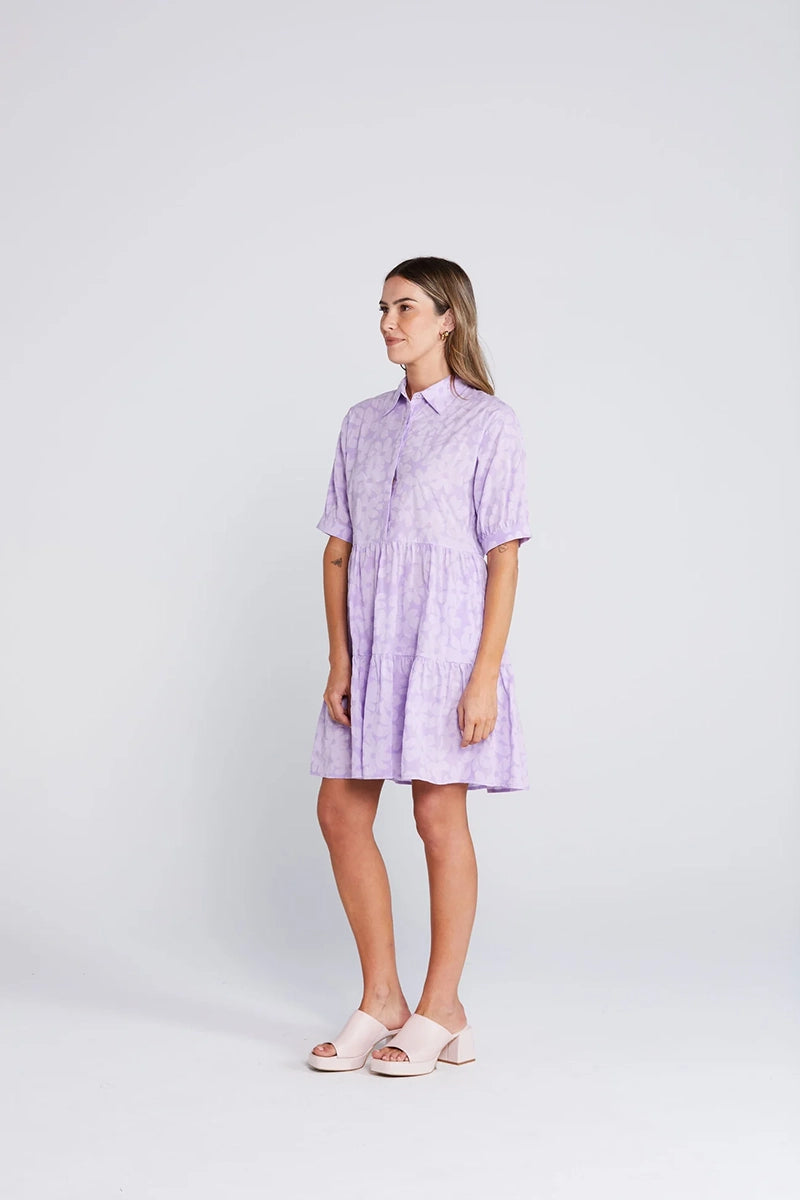 The Nova Dress is an easy-wear classic. Its regular length and concealed front placket with buttons give it a sophisticated charm. The in-seam pockets add practicality, while the gathered sleeves with cuffs offer a touch of detail. Cut in a delightful Violet Daisy 100% Cotton print, this dress is your perfect choice for a polished and effortless look that's ready for any occasion.