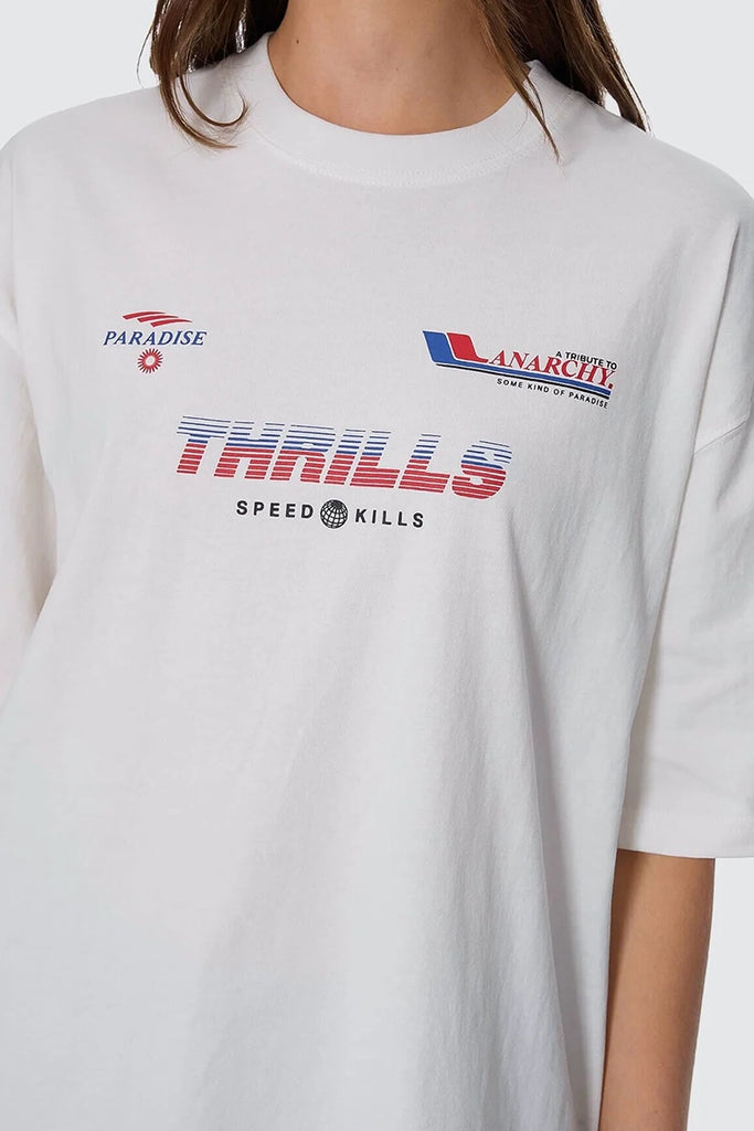 The Anarchy In Paradise Oversized Tee in Dirty White dials up the vintage graphic tee punch with a roomy cut and no-fuss finish. Made from heavyweight cotton jersey, this organic cotton t-shirt is all about structure, comfort, and street appeal. The oversized silhouette offers wide sleeves and an easy drape, ideal for pairing back with mini skirts or women's jeans. A clean hit from our Thrills tee Australia collection, perfect for fans of bold statements and effortless street style. It's iconic with a little anarchy!