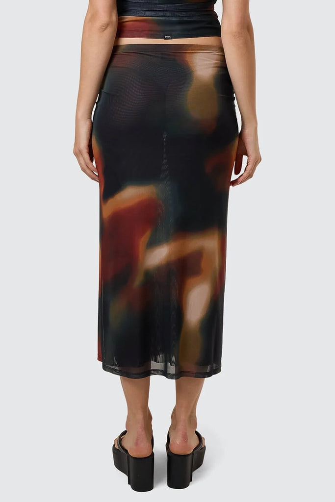 Make a statement with the Metamorphic Daze Slip Skirt in Black, featuring a bold, fiery gradient print blended into a fluid, body-skimming cut. Made from a soft-stretch poly blend, this midi skirt sits snugly on the waist with a clean elastic finish and glides smoothly over the hips for a polished, flattering silhouette. Perfect paired with the matching Metamorphic Daze Halter Top, this piece from our Australian women's clothing spring collection is built to stand out, ideal for those who embrace the chic and edgy energy.