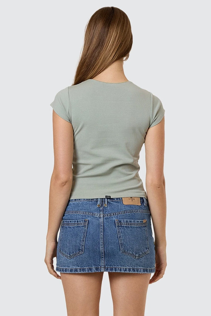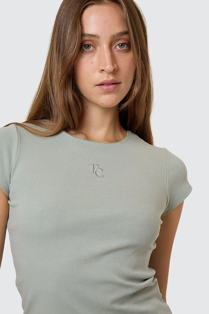 The Priority Club Tee in Dirty Sage brings a street subtle edge in a cropped cut and slim fit. Made from a thick organic cotton t-shirt jersey blend, it offers soft stretch, a classic crew neckline, and a snug fit that holds its shape. Available in an earthy sage tone, this relaxed-fit tee keeps things grounded while still standing out. A chic alternative to your basic black oversized tee, this one is fitted, fresh and flattering, a strong pick from our Thrills tee Australia spring line-up.
