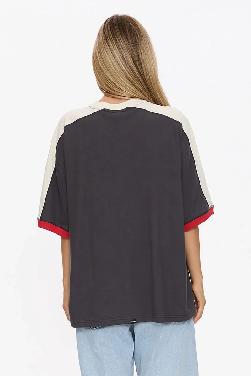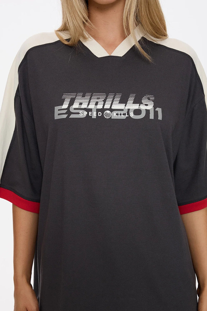 Speed meets style in the Speed Kills V-Neck Oversized Tee in Merch Black. Made from a lightweight vintage slub organic cotton tee, it offers that perfectly worn-in texture with a lived-in edge. Designed with a boxy, exaggerated fit, this oversized tee is made for the streets with contrast sleeves and bold Thrills chest print, setting it apart from the pack. Whether youre rocking it solo or paired with wide, baggy denims, this streetwear t-shirt is pure attitude.