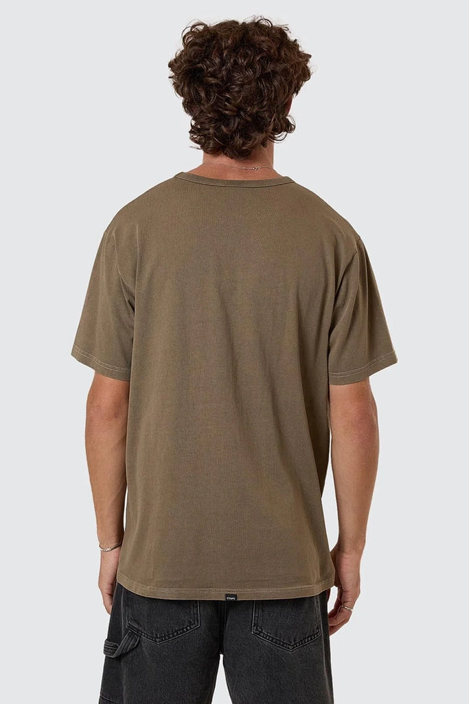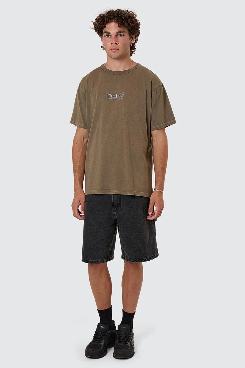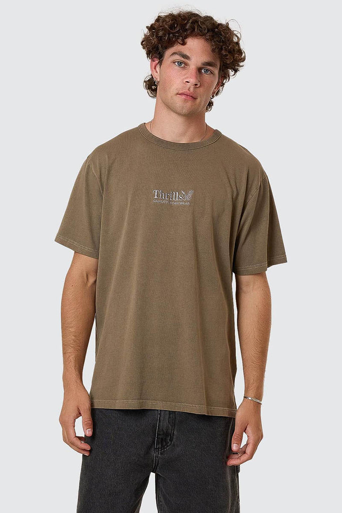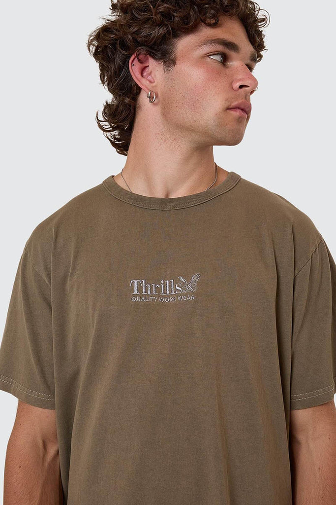 Laidback and built to wear hard, the Thrills Workwear Embro Merch Fit Tee in Desert delivers a clean silhouette with a tough edge. Made from heavyweight organic cotton t-shirt jersey, this relaxed fit tee features a roomy fit, classic crewneck, and tonal centre-front branding that nods to core utility styling. The washed-down colour and dry hand feel give this vintage graphic tee that sun-faded, lived-in vibe. Pairs well with anything, including men's cargo pants or low-key denim shorts. It's a no-fuss classic in the Thrills tee Australia lineup, delivering understated branding in a super wearable look.