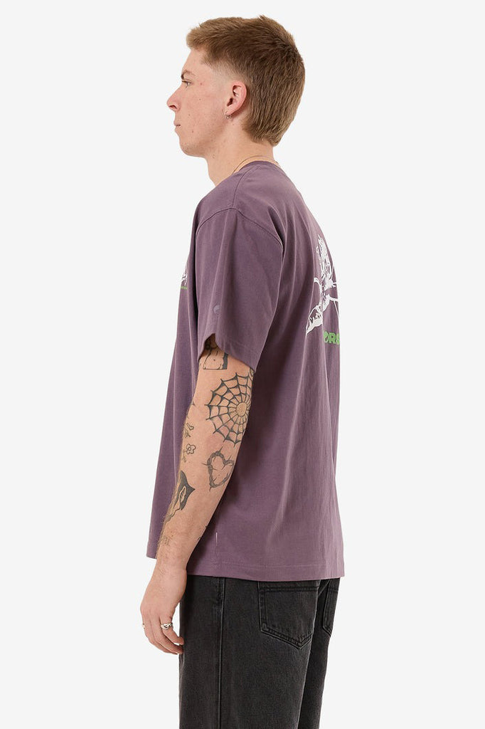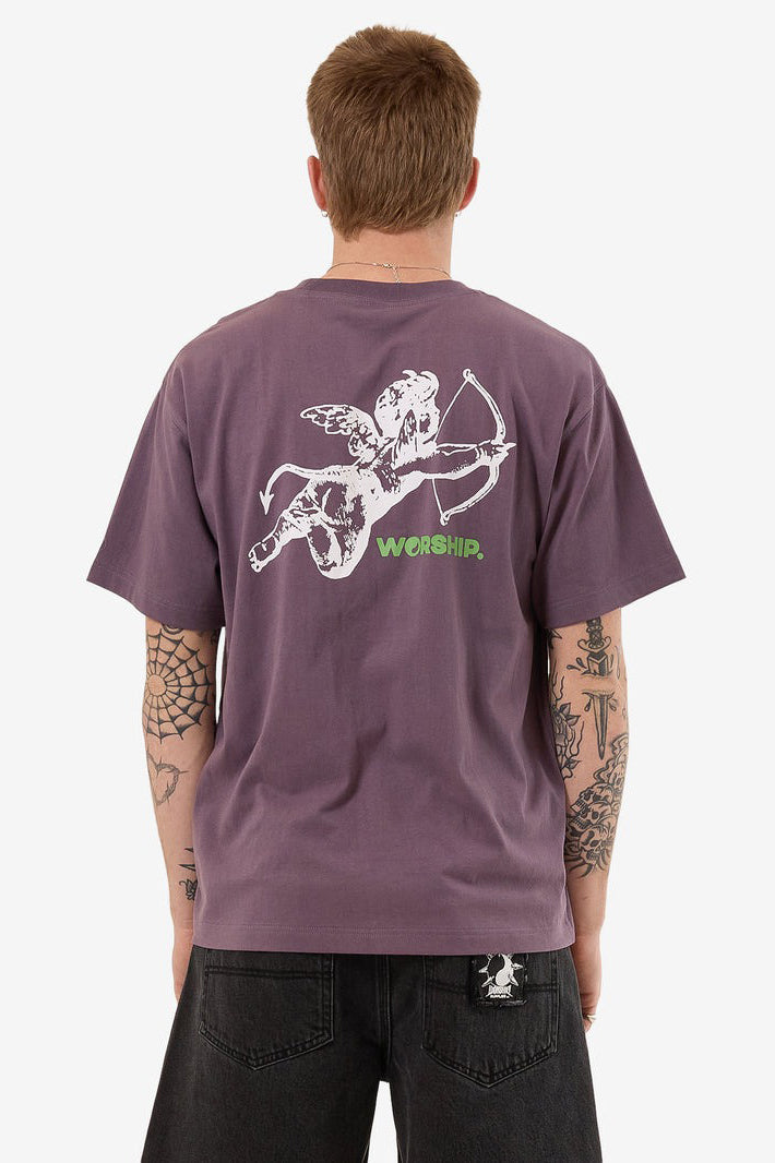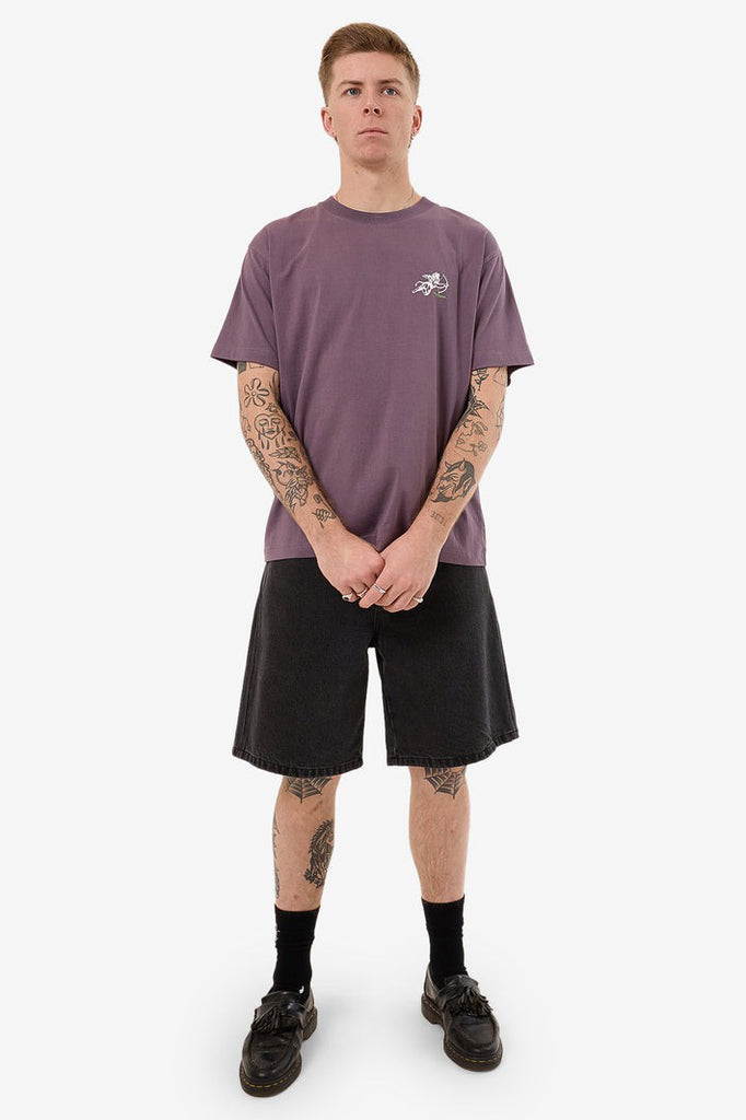 Designed for everyday wear, the Cherub Tee in Purple Reign features short sleeves and double-stitched edges for a clean, roomy finish. Crafted from a 245gsm cotton jersey, this men's tee combines comfort with a standout style and heavy-wearing durability. Available in a vibrant purple shade complemented by a minimalist chest graphic and an oversized cherub print on the back.