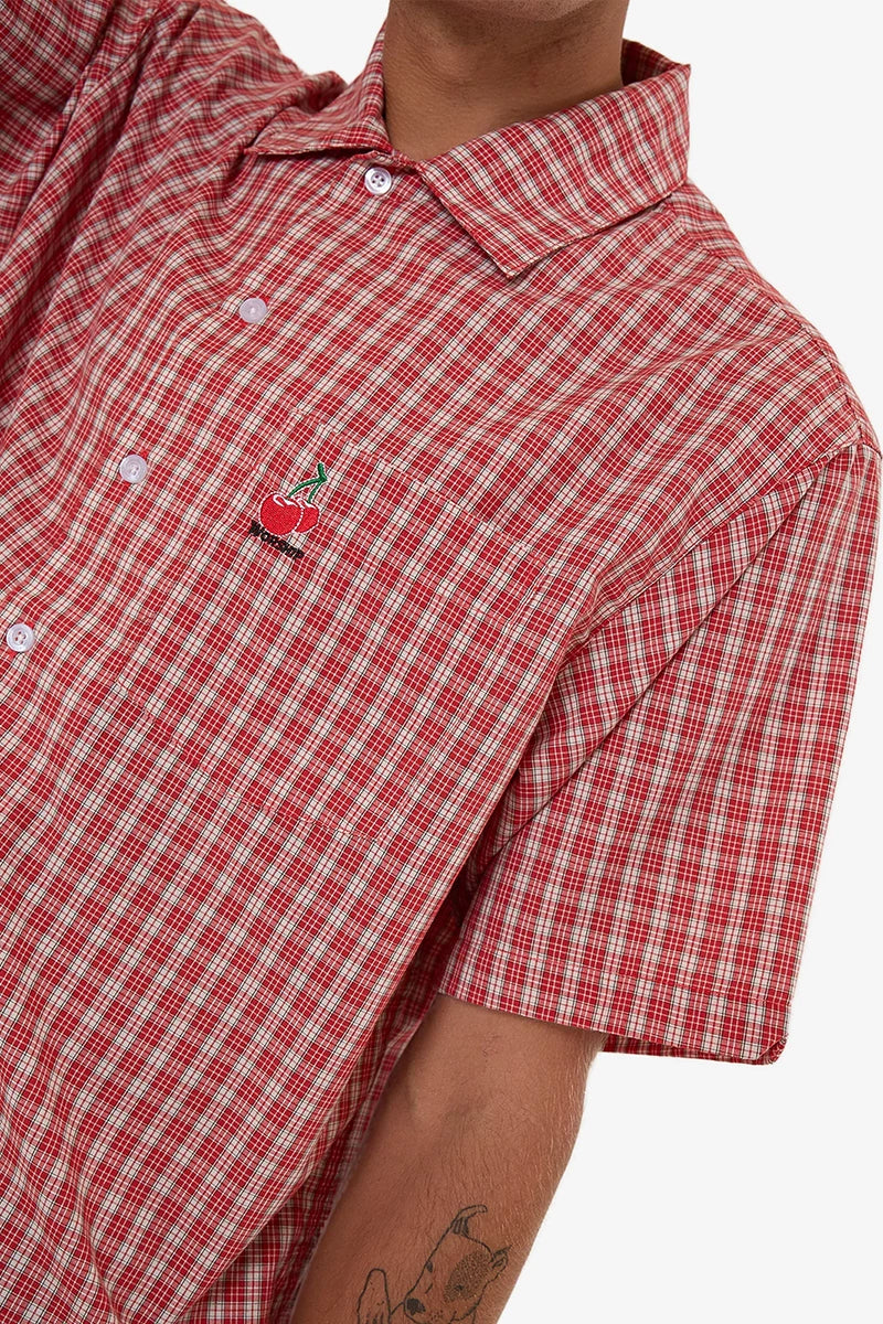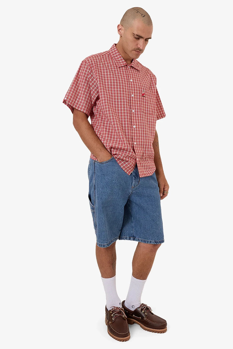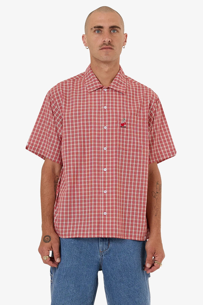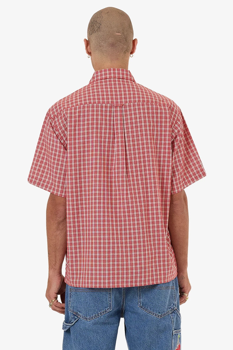The Glazed And Confused Short Sleeve Shirt in Cherry Red features a boxy fit and a clean yarn-dye check thats all street and effortless style. Made from a durable poly-cotton drill, this button-up shirt is structured without being stiff, perfect for layering over men's graphic tees or wearing on its own. Finished with a front chest embroidery for a subtle graphic hit.