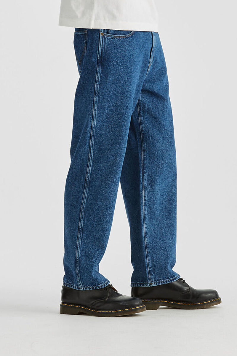 The Slacker jean is our relaxed straight fit. Designed to sit low, with a relaxed top block and leg. Made in a deep indigo wash, they feature in a rigid denim with heritage inspired stitching and vintage metal hardware.
